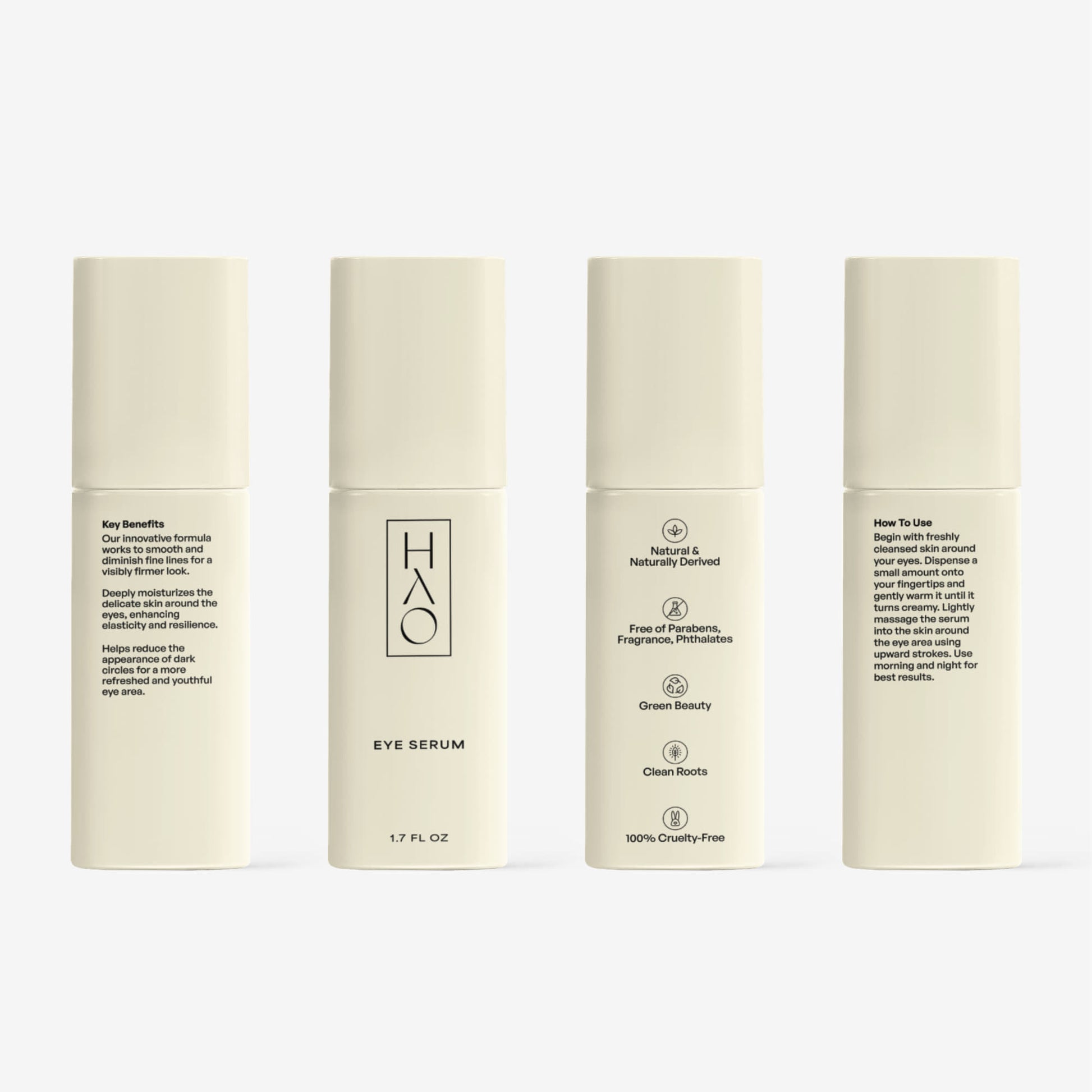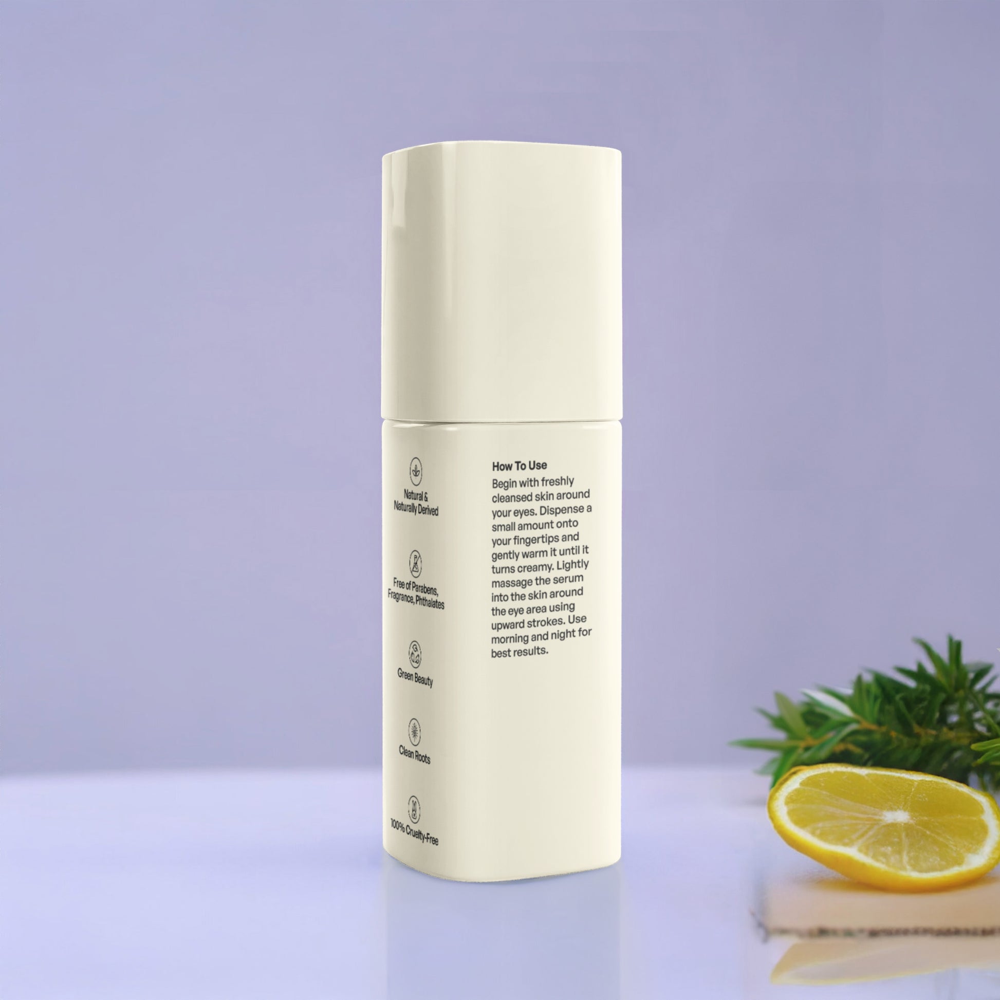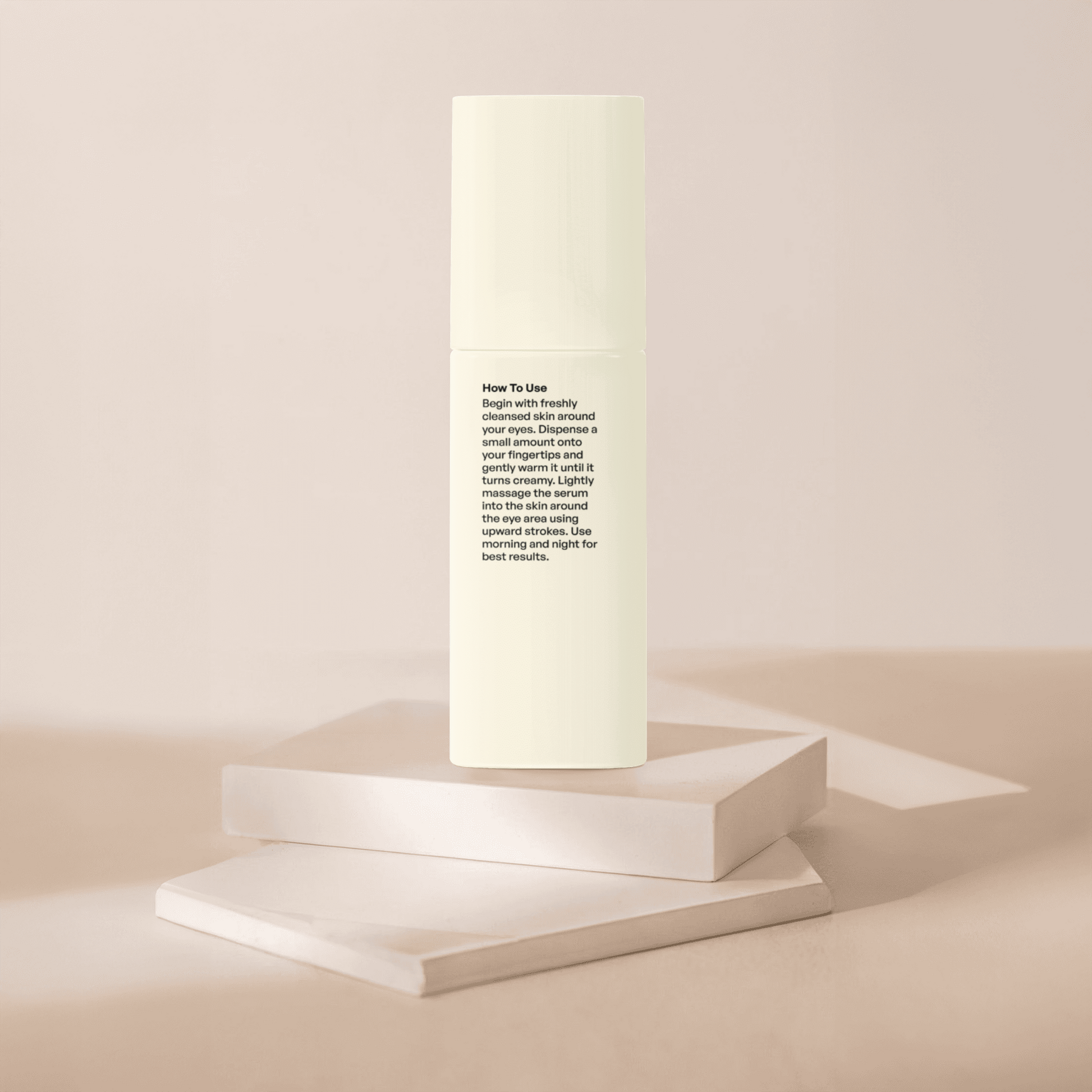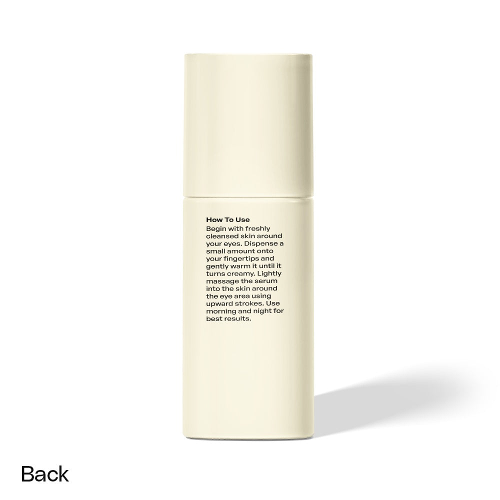 Begin with freshly cleansed skin around your eyes. Dispense a small amount onto your fingertips and gently warm it until it turns creamy. Lightly massage the serum into the skin around the eye area using upward strokes. Use morning and night for best results.