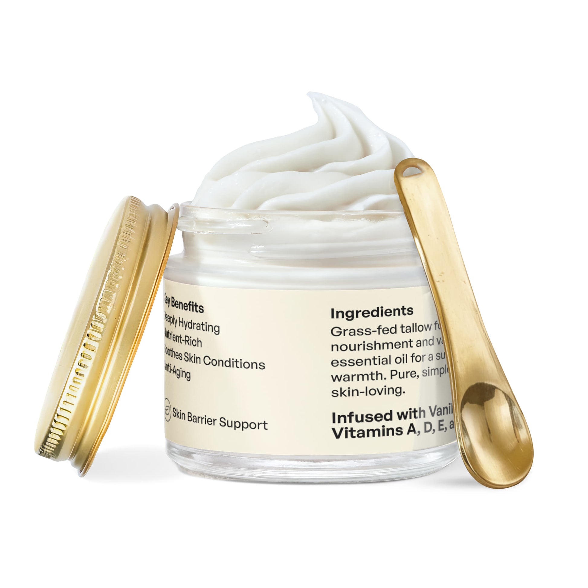 Grass-Fed Tallow - Rich in skin-compatible fatty acids and vitamins A, D, E, and K, it deeply nourishes and repairs the skin, restoring moisture balance, improving elasticity, and strengthening the skin barrier for long-lasting hydration.